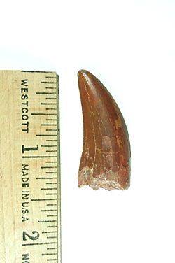 Item # D102outstanding. This is the dinosaur from which they modeled the famous velociraptors for the Juraissic Park movies. An awesome predator, to be sure. One look at this tooth, and you know this. The tooth has serrations, both on front and back. There is some wear on these serrations (more to the front than back), but that is to be expected. The dinosaur that owned this tooth actually used it! Get a chance to actually touch a tooth from this fearsome predator. If you did this while it was alive, it wouldn't have been very pleasant. It could have made short work of a Mike Tyson or actually any human! This tooth seems to be very rare. See photos to the right. My source says it is from