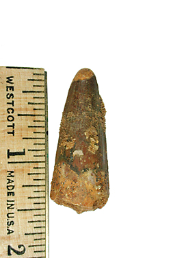This is a gorgeous, larger tooth from a carnivorous dinosaur called Spinosaurus sp. This bad boy was the sail-backed villain in the last Juraissic Park movie. He was big and his teeth got big. Some say he could get to be 40-feet long, or more. (I don't think he could really beat a T-Rex, though, like was portrayed in the movie.) Wait until you wrap your fist around this beauty. It seems to be close to 2/3 of the length is enamel, a definite plus. See the photos on the right. This will be a jewel in anyone's collection! My source says it is from